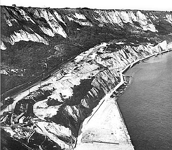 ![]() This 1953 aerial view shows the length of earlier sea wall which was widened and weighted in the following two years. Left of centre is the concrete mixer, used for producing the blocks and protective covering over the chalk weighting. Above centre, there is evidence of chalk removal, this area being used as the source of much of the weighting material.
