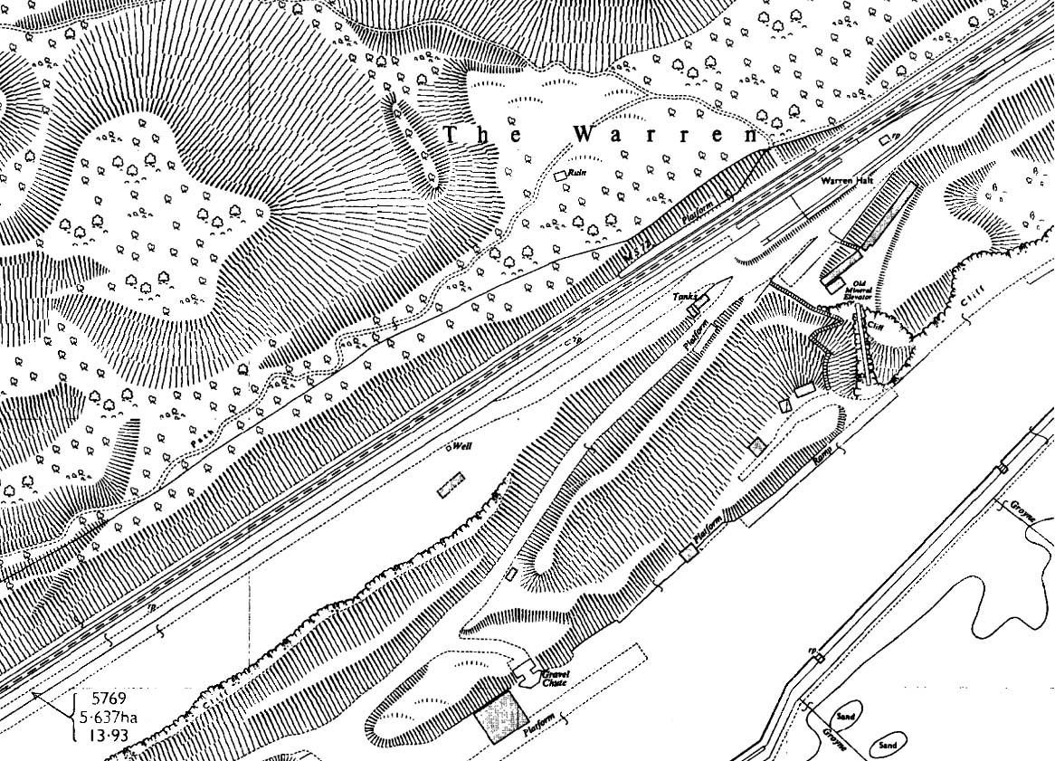 1963 1:2,500 OS map. Warren Halt is still shown but having closed to the public on 25 September 1939 it is now used only by railway staff and contractors working on stabilising the Warren. The up platform has been shortened. The works depot, with a siding off the Dover line, is seen top right. Numerous other structures are shown including a mineral elevator and a gravel chute.