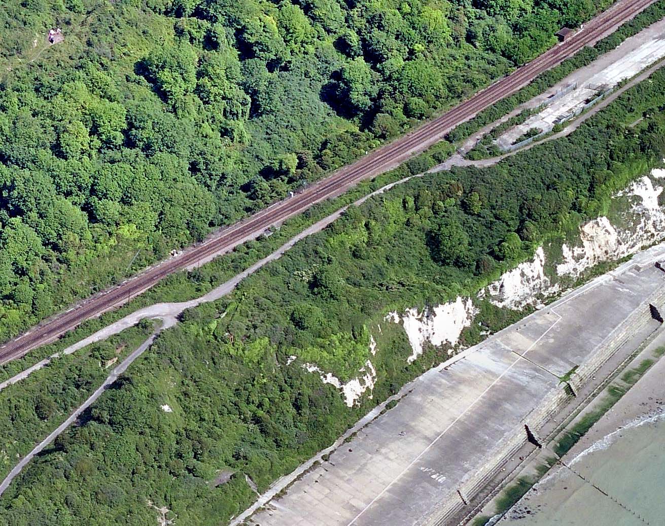 Aerial view showing the site of Warren Halt. The west end of the halt was opposite the point where the two tracks converge on the left; the east end was just before the works yard on the right. A number of structures can be made out in the undergrowth to the south of the line which correspond to the structures identified on the 1963 map.
