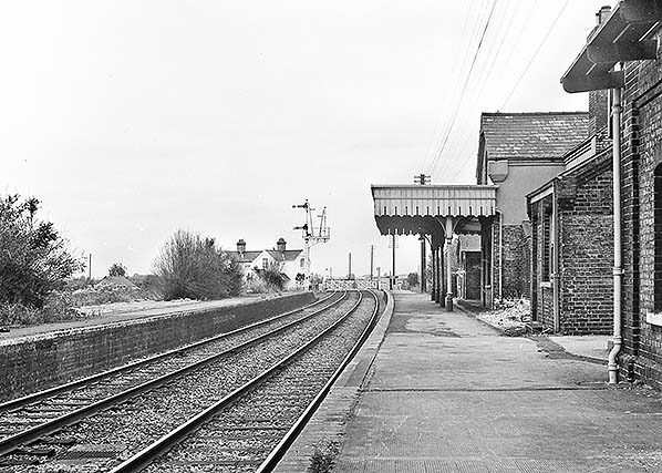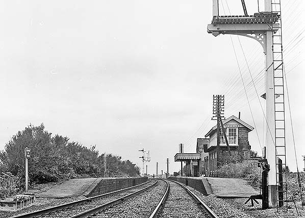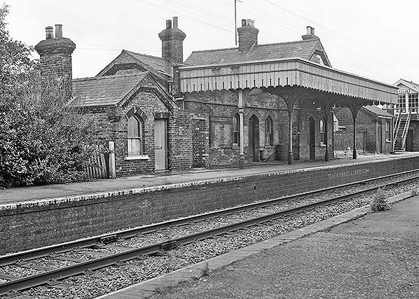 ![]() Looking along Fordham up platform towards Ely c1971. The down waiting room has been demolished but little else has changed, and the gas lamp remains beneath the up platform canopy. One less obvious change, however, is the removal of the crossover; this had been removed after total closure of the Mildenhall branch. The cottages left of the level crossing were the original pair.