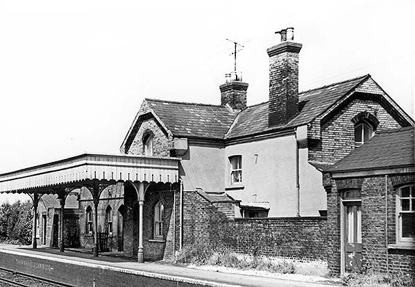 Photo by John Mann ![]() Fordham up platform station building viewed from the down platform, looking towards Newmarket c1971. The building on the left, which was possibly a ticket collector's office, retains a ‘Staff Only’ sign while towards the far end of the canopy one gas lamp has been retained. The canopy remains in an apparently good state of repair.