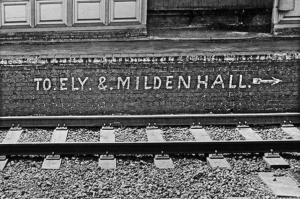 The direction sign on the down platform face in July 1969, almost four years after closure to passengers. As on the up platform, the rather pointless full stops are present. As at Burwell, considering Fordham station would have been used almost exclusively by local people, the need for these signs is questionable.