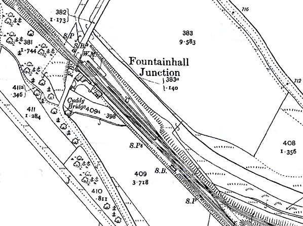 The line opened on 2 July 1901 with Fountainhall station changing its name to Fountainhall Junction on the same date. In order to accommodate branch trains, the Fountainhall goods yard was rebuilt. The up platform became an island with the outer face forming a bay platform for the branch. The good shed was demolished and replaced with a cattle dock; there was a 1.5 ton crane at the end of the dock. One of the three sidings was also lifted. A second signal box was built opposite the junction on the up side of the main line to control access to the branch. There was a water column at the south end of the island platform.