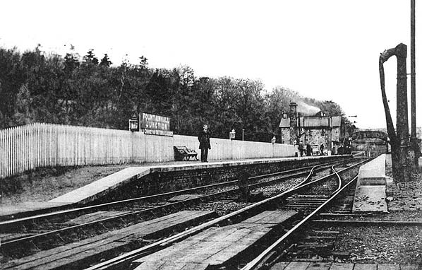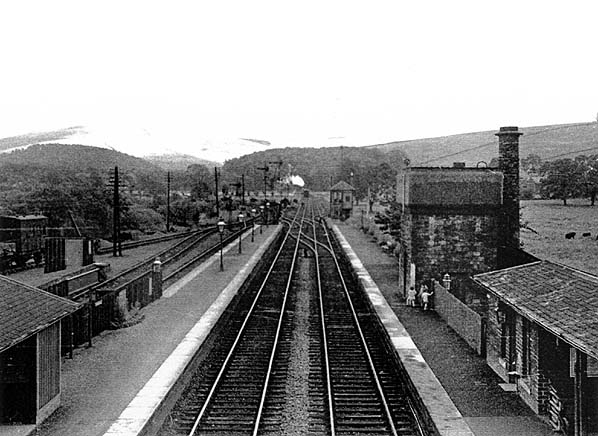 The station had two facing platforms. The main station building, which dates from 1870, was at the north end of the down platform and comprised a two-storey house with a slate pitched roof, at right angles to the platform. A two-storey wing, also with a slate pitched roof, had its upper floor facing onto the platform; the booking office was in this part of the building. In front of this there was a single-storey brick building with a hipped roof which included an open-fronted waiting area in front of the booking office and toilets; this extended along the platform beyond the house. A few yards beyond this building there was a stone tower at the back of the platform with a cast iron water tank on top and a brick chimney at the rear.