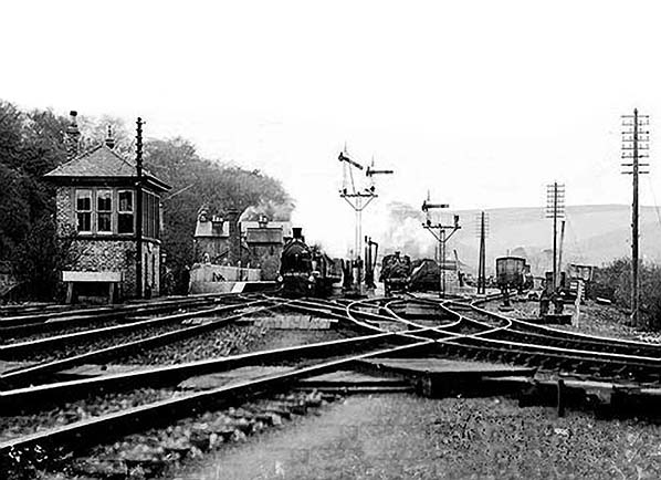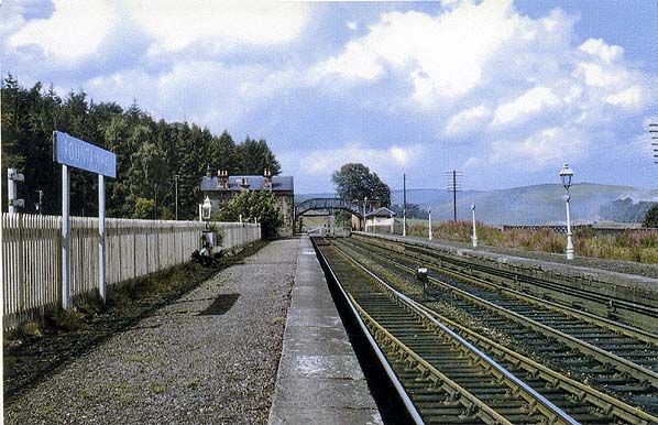 Two miles south of the summit in the 'middle of nowhere' the NBR built what was to become one of the most famous junction stations in Britain in the heart of the Lees Bog. Prior to the railway, apart from a remote shepherd’s bothy, there were no buildings or inhabitants in the area, but the railway brought its own community in the form of Riccarton railway village comprising terraced housing, a shop on the station platform, a school and a three-road engine shed with room for six locomotives; a two-road carriage shed, two signal boxes, a gas plant, turntable and coaling facilities were also provided. At Riccarton, the line made a junction with the Border Counties line extension running through Reedsmouth and Bellingham to the Tyne Valley line at Hexham.