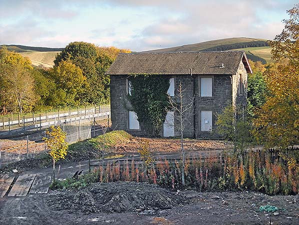 ![]() Fountainhall station building, looking east from the diverted road close to the overbridge in October 2015. The building is boarded up and out of use.