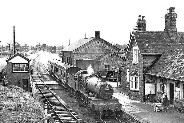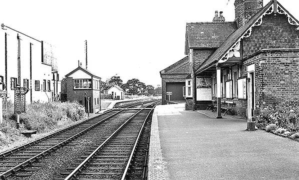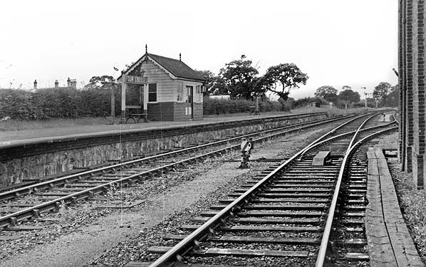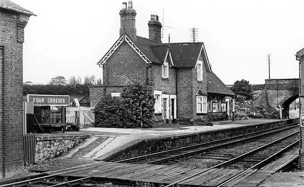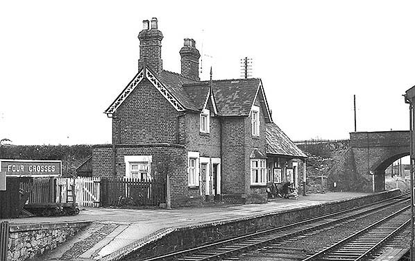 Copyright photo from the John Mann collection The Four Crosses station building and up platform seen in 1955.Copyright photo from the John Mann collection Looking north along the down platform at Four Crosses station in the early 1960s.Copyright photo from the John Mann collection The station building at Four Crosses seen from the down platform in the early 1960s.Photo from the John Mann collection ![]() Looking south along the up line at Four Crosses station in the early 1960s. The down platform can be seen to the left and the goods shed to the right. Photo from the John Mann collection Four Crosses station looking south in the early 1960s.Copyright photo from the John Mann collection ![]() Four Crosses station looking north in 1974. The down platform is seen to the right and the cattle loading platform to the left. Photo by John Mann