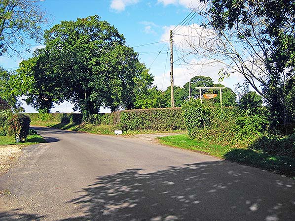 ![]() On the Fransham to Dunham road at Fransham, looking north along the lane at the location of the level crossing in October 2017. Two tracks crossed the road at this point, the nearer a siding and the farther the single running line. The station site is to the left, the up direction, towards Lynn.