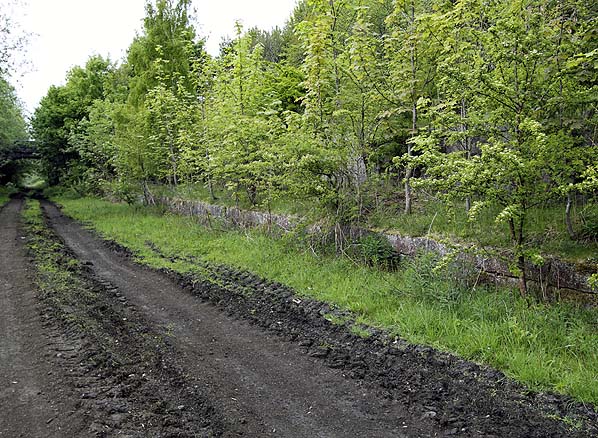 ![]() This wall has often been mistaken for the platform. Fushiebridge station was on the far side of the bridge and the wall has nothing to do with the station or the goods yard. (May 2011).