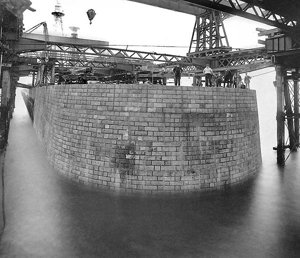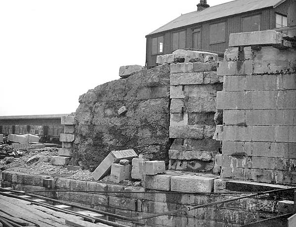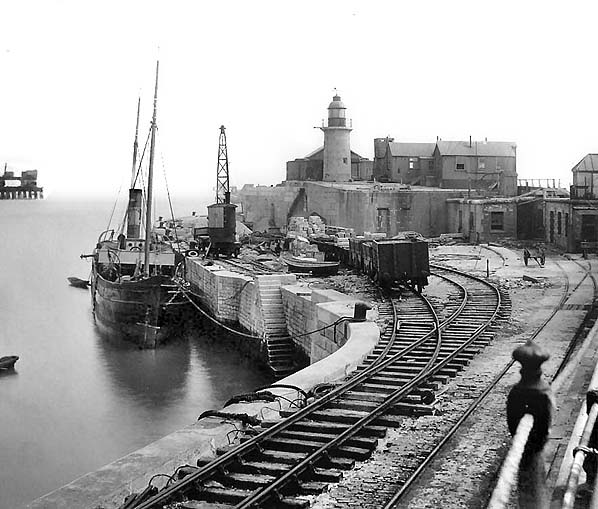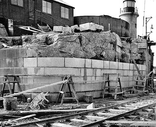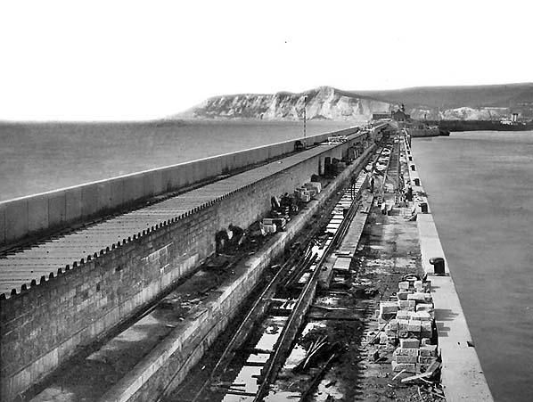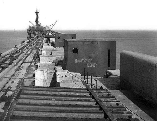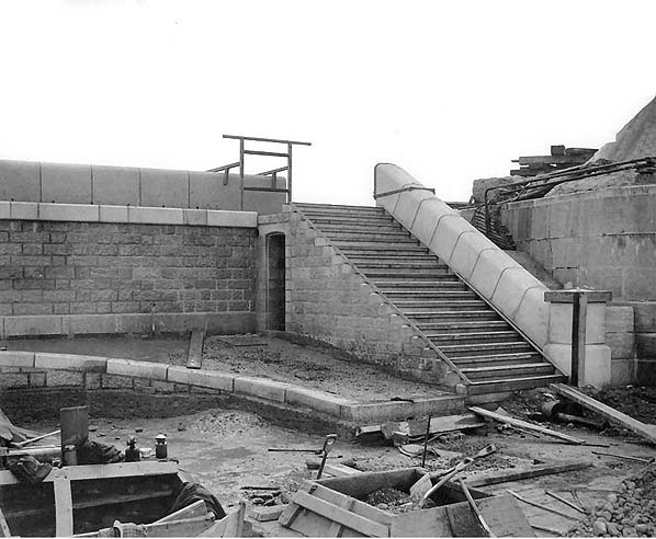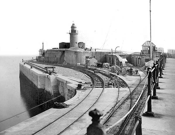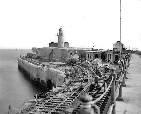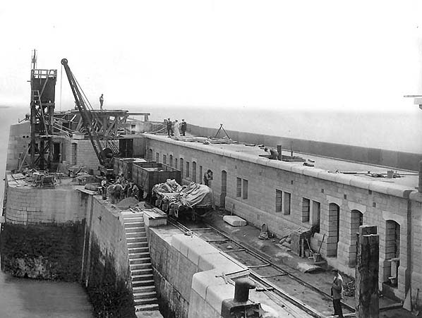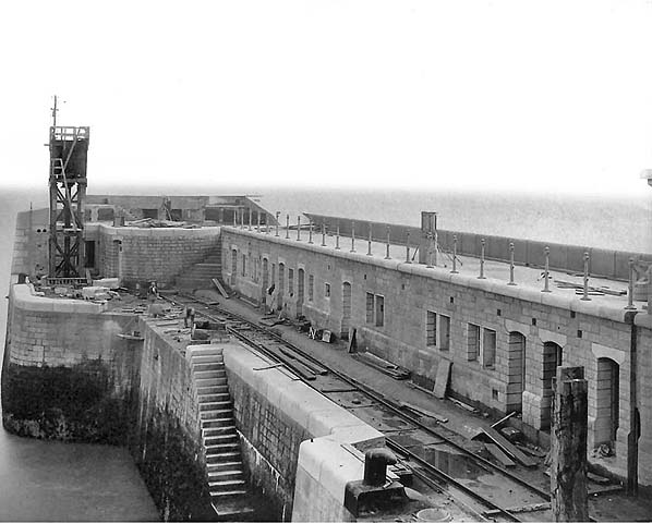 October 1907. The pier head is nearing completion. The two 12 pounder QF gun emplacements are seen, one immediately to the right of the wooden tower and one just to the left of the slope. Ammunition lockers are set into the wall between them.