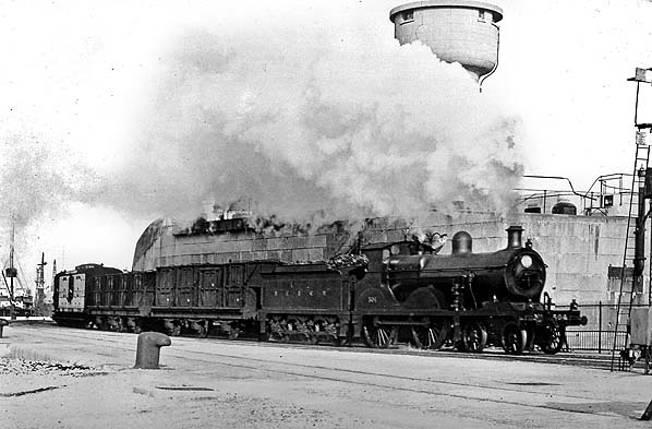 SE&CR locomotive No. 504 is seen alongside the turret c1910. In the background is the Pier Turret Battery command post which was built on top of the old lighthouse replacing the lantern room.