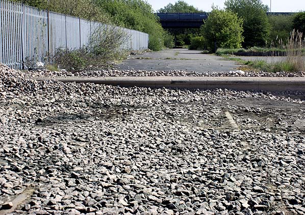 A short section of the former GCR line to the Bidston sidings and engine shed was still in situ when this picture was taken in April 2011. The view is looking east towards the site of the sidings and engine shed. Photo by Paul Wright