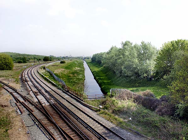 Looking east from Bidston West Junction in April 2011. In the centre of the picture is the River Birkett. To the right of the river is an area with trees; this is the site where the former GCR line from Wrexham opened out into extensive sidings and a locomotive shed. To the left of the river running away into the distance is the route of the original Hoylake Railway which later became the Wirral Line between Liverpool and West Kirby. The line going off to the left is a siding that follows the course of the former Bidston Triangle west curve for a short distance. It was installed to accommodate Wrexham trains that terminated at Bidston station, behind the photographer, but as most Wrexham trains turn around at the station it was seldom used in 2011.