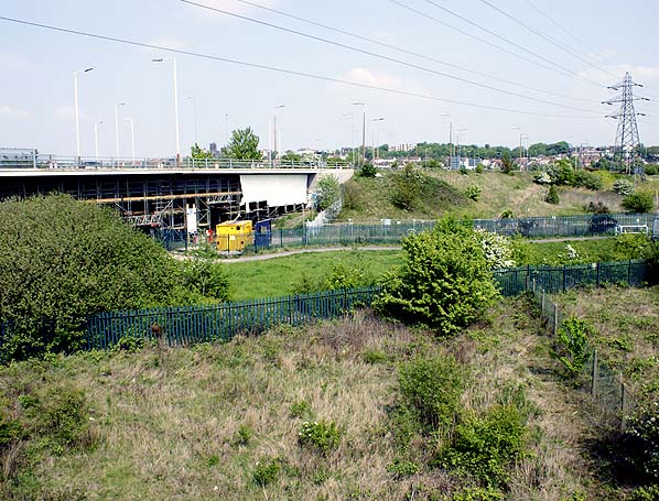 Looking northeast along the trackbed of the former Seacombe Branch from the footbridge that was just to the north of Seacombe Junction. The concrete fence posts seen to the right date back to the time of the railway. The road coming in from the right is the M53 to Mersey Tunnel link and it uses the course of the Seacombe Branch to access the Kingsway Tunnel.