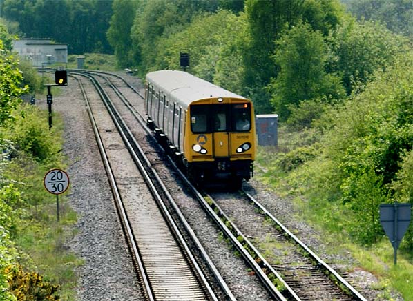Looking south from the site of Seacombe Junction towards Bidston North Junction in April 2011. The Seacombe branch came in from the left at about the point where the 20/30 speed sign is located. Just beyond the signal showing a yellow light the 1952 Bidston Dock branch came in from the left and joined the main line. Bidston North Junction had been at the point where the line can be seen curving to the left. A line had also curved to the right giving direct access to Bidston station and the lines to both West Kirkby and to Wrexham.