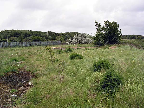 Looking northeast along the trackbed of the GCR line in that ran from their sidings at Bidston to the Birkenhead Dock system in May 2011. The line opened in 1907 and allowed trains from the GCR system to run directly into the docks. Beyond the metal railings is the former Wirral Railway between Birkenhead and West Kirby. The GCR line crossed the Wirral Railway on the level.