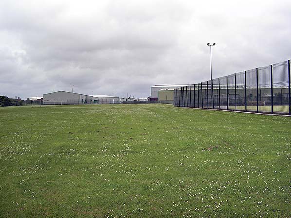Looking east at the site of Bidston Locomotive depot in May 2011. The depot was located roughly between the football posts seen in the distance to the left and the lower fence seen to the right. Photo by Paul Wright