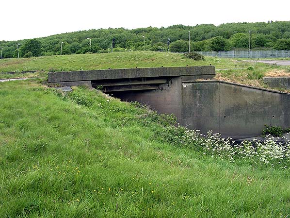 When the GCR opened a short line between their Bidston sidings and the Birkenhead dock system in 1907 it was carried over the River Birkett by a wooden trestle bridge. The bridge was replaced by a concrete structure in 1957. The bridge is shown looking north in May 2011.