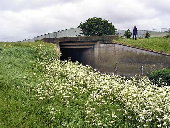 Looking east at the 1957 British Railways constructed bridge which carried the line between the Bidston sidings and the Birkenhead docks over the River Birkett as seen in May 2011. The bridge replaced an earlier 1907 timber structure which had been built by the GCR.