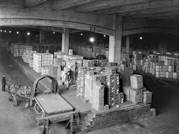 The interior of Shed B and the amount of goods traffic handled by it is evident, the horse and trailer await loading with produce to be distributed to businesses in the City Centre.