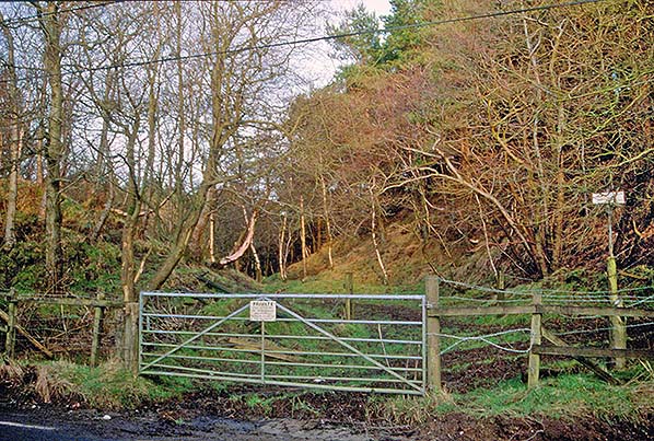 Photo by Alan Young ![]() The former entrance to the eastern section of Catlow Quarries is seen here in January 2005. The OS map of 1891 appears to show the two tracks seen here. Until the early years of the twentieth century a blacksmith’s business was located on Southfield Lane, just to the right of the entrance. Much of the former quarry east of Southfield Lane, in council ownership, has been planted with conifers but with a deciduous screen, as seen in the foreground. At the time of this photograph a planning application had been made to develop a holiday village in the disused quarries on both sides of Southfield Lane.