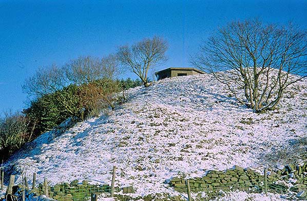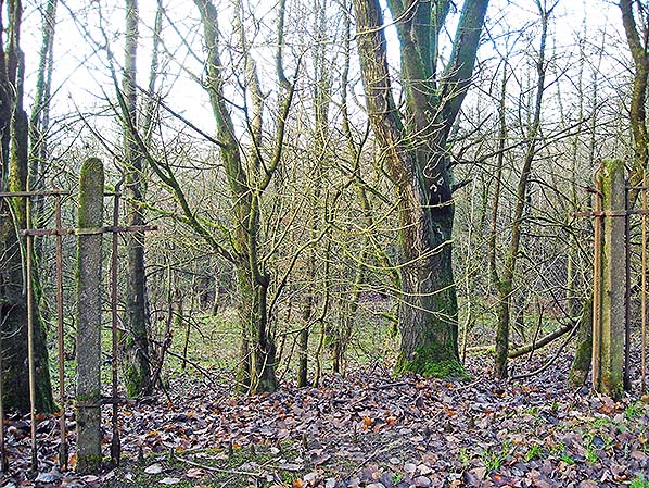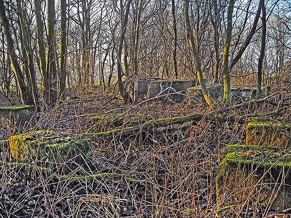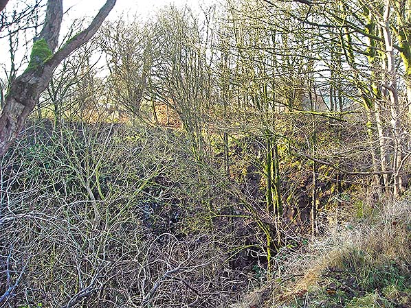 Photo by Alan Young ![]() In World War 2 the recently-closed Catlow Quarries were used for Home Guard training and this ‘pill box’ lookout post was established on the bluff at the southern end of the quarries, east of Southfield Lane from which this photo was taken on 25 February 2001. Much of this section of the quarries was planted with conifers as can be seen on the horizon. In 1902 Nelson Corporation built a smallpox isolation hospital in the field off the photo to the right; nothing remains of it.