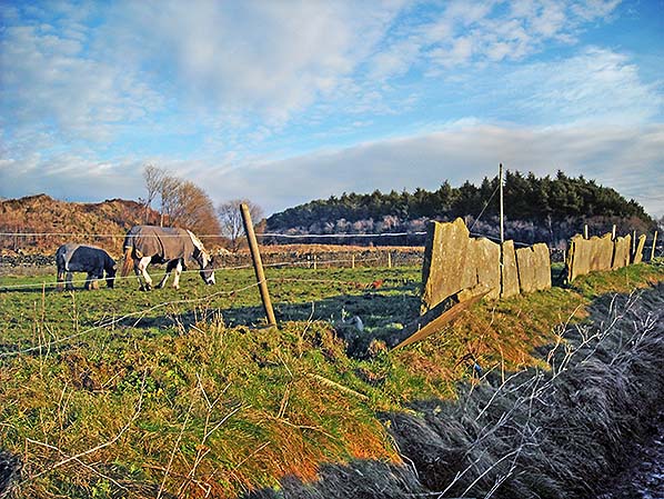 Photo by Alan Young ![]() On the southern fringe of Catlow Quarries Nelson Corporation opened a scarlet fever isolation hospital after World War 1; it was about 300yd west of the existing smallpox hospital. The fever hospital stood on the field to the left where the horses are grazing, and nothing remains of it in December 2016, the date of this photograph. Spoil from the abandoned quarry west of Southfield Lane is seen far left and the coniferous plantation ahead is in the section east of the lane. The use of flagstones for walling will be noted; Catlow Quarries produced both massive and flag sandstone.