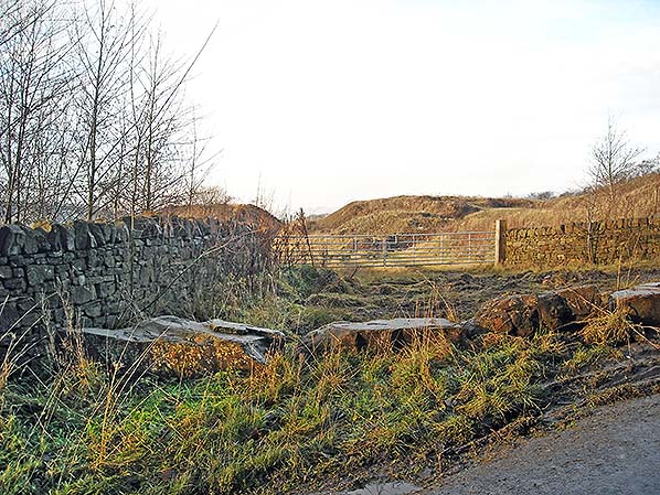 ![]() Despite the Conservation Area designation of much of Southfield and Catlow in 2003, a planning application was lodged in 2005 for a holiday village with over 120 timber chalets and other facilities in the former Catlow Quarries. The project was scaled down to affect only an area west of Southfield Lane at the southern end of the quarries, and ground preparation was undertaken. The entrance to the empty site is seen here, looking west from Southfield Lane in December 2016. Presumably the huge stones preventing unauthorised access to the site came from this quarry.