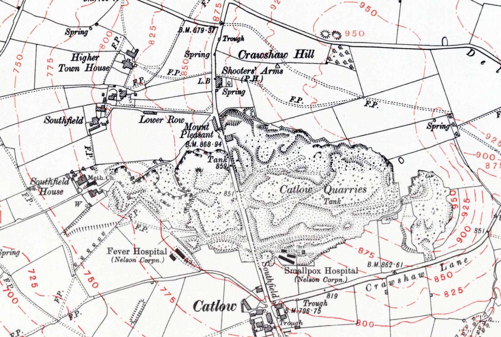1930 1: 10,560 OS map. By 1930 Catlow Quarries had expanded to their fullest extent both east and west of Southfield Lane. Stone was conveyed from the quarries to Chaffers Siding via Barkerhouse Road which leaves Southfield Lane north-west of the Shooters Arms, and to the town and canal via Southfield House. Catlow Quarry office was at the northern end of Mount Pleasant cottages. The relatively isolated location prompted Nelson Corporation to build small hospitals, one within the quarry for victims of smallpox within the quarries and another for scarlet fever patients on the opposite side of Southfield Lane just outside the quarries. Main Delves field (not named) containing numerous abandoned bell-pits where coal was extracted before the Industrial Revolution is on Crawshaw Hill, north of the Shooters Arms. Only the small, most easterly section of Catlow Quarries has been worked since World War 2.