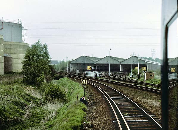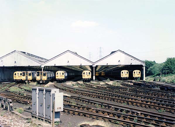 Croxley Green depot, with a selection of Class 501s and 313s in July 1985. Taken from the window of a train to Croxley Green.