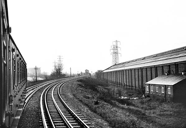 The Croxley Green Junction - Colne Junction Curve seen from a window of the 8.01 am Croxley Green - Euston train on 20 February 1960. Croxley Green depot is on the right.
