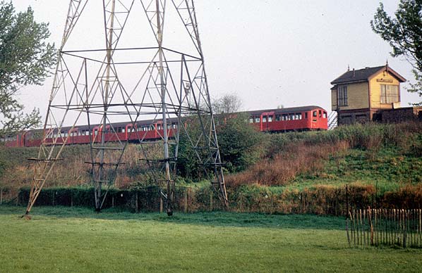 Bakerloo train between Colne Junction and High Street Junction in May 1966. Colne Junction signal box is visible above the houses to the left of the pylon.