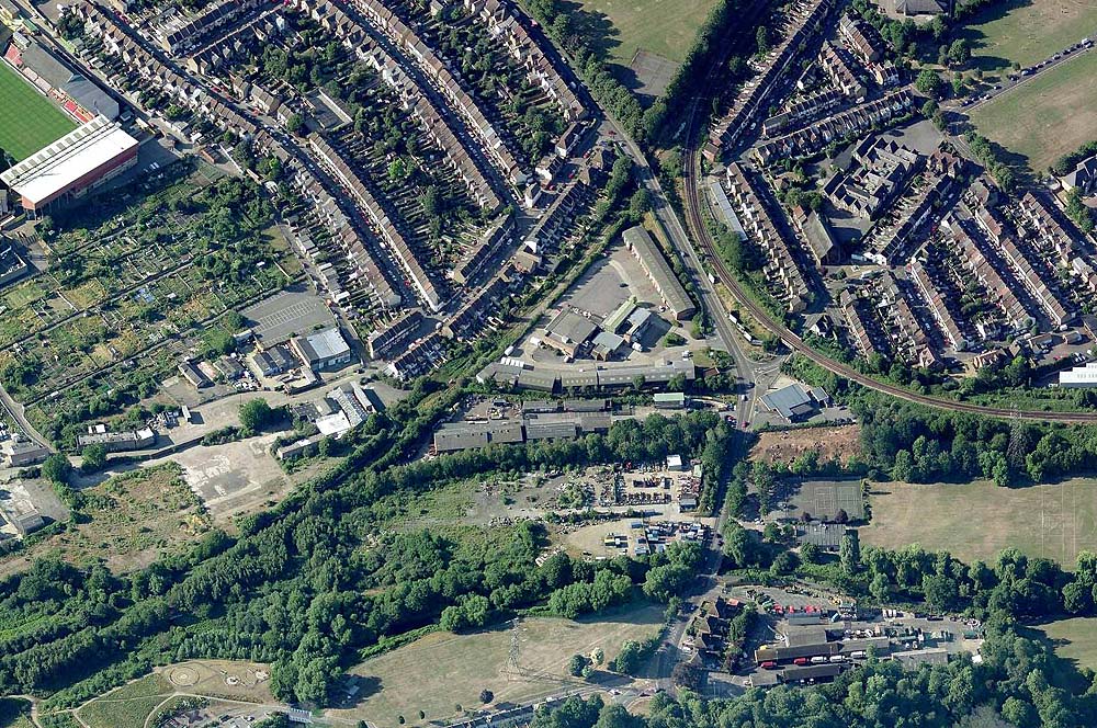 Aerial view from the late 2000a showing the site of the triangular junction and the depot. The Colne Junction - High Street junction curve is to the right, this is the only part of the triangle still in use, The Croxley Green branch to the left; the track is still in place but the line has been out of use since March 1996. This track will be relaid for the Croxley Rail Link which is planned to open in 2016. The course of Croxley Green curve to the West of Wiggenhall Road is intact and wooded. The site of the depot to the south of the curve is clearly visible. The east end has been put to light industrial use.