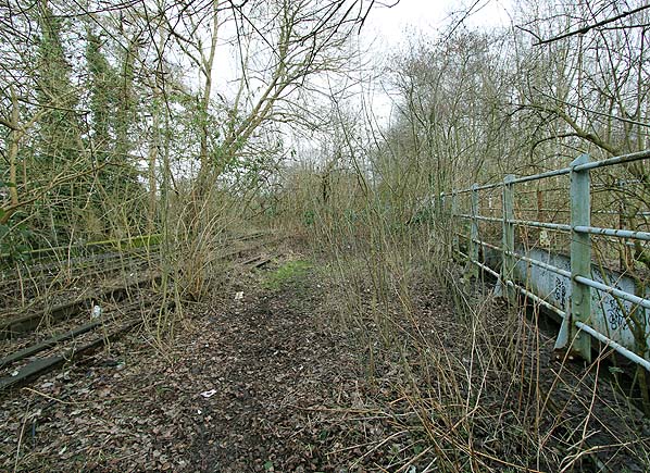 Looking north-east along the Croxley Green branch in February 2013. This is bridge 3 across the River Colne which is in the middle of Croxley Green Junction. The junction between the Croxley Green and Rickmansworth branchs is behind the photographer. The Croxley Green curve and the Watford Junction lines diverge on the far side of the bridge.