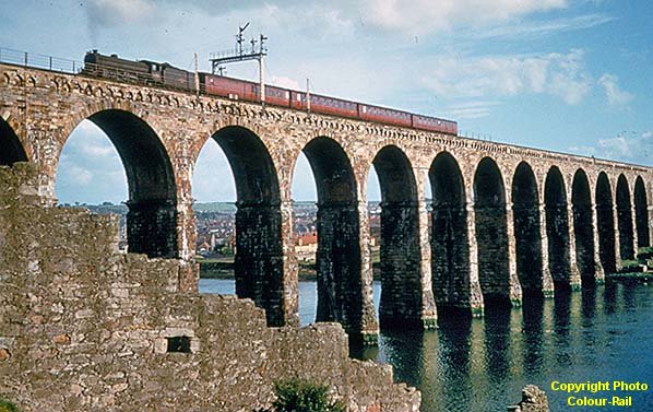 In August 1847 the Newcastle & Berwick amalgamated with the York & Newcastle Railway, and it was the newly-created York, Newcastle & Berwick Railway (YNB) which was responsible for bridging the gap between Tweedmouth and Berwick. The foundation stone was laid on 15 May 1847, under N&B administration. Train services began on 29 August 1848 over a temporary bridge across the Tweed, but the permanent Royal Border Bridge opened to freight on 20 July 1850, whilst the formal opening to passenger trains was performed by Queen Victoria on 29 August 1850. The 720yd stone and brick structure is gently curved, carries two railway tracks, and possesses 28 arches, each of 61ft 6in span, and only 12 of which are actually crossing the river. The maximum elevation of the rails is 120ft. To the credit of the architect Robert Stephenson, and contractors McKay & Blackstock, the bridge has required no major repairs in over a century-and-a-half. Regrettably, posts and wires added when the line was electrified have somewhat marred the bridge’s appearance. The structure is Grade I listed.