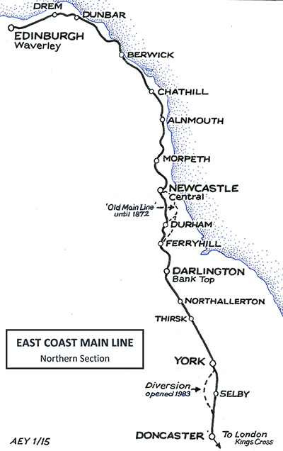 From 1869 the North Eastern Railway began to operate trains over the North British section of the ECML north of Berwick in exchange for the NB being granted running powers over the NER Hexham-Newcastle route to and from Hawick and Riccarton Junction. As a result the need to change locomotives and crew was no longer needed at Berwick. Intense competition with the West Coast main line (London Euston-Edinburgh) encouraged the acceleration of ECML services from the 1880s and apart from the disruption caused by the two world wars, speeds and frequencies have steadily improved. Reflecting the limited stops made by express trains a notable feature of the ECML in Northumberland was the provision of water troughs at Lucker enabling steam locos to take on water without stopping. The ECML has hosted some of Britain’s fastest scheduled services such as The Flying Scotsman and The Talisman. The Flying Scotsman was allowed 9½ hours between the capital cities in 1876, reduced to exactly four hours in 2015. Regular weekday ‘inter-city’ Newcastle-Edinburgh northbound trains increased from 17 in 1961 to 38 in 2015. Prestigious motive power has hauled ECML trains, notably streamlined A4 Pacifics from 1935-61 and Class 55 ‘Deltic’ diesels through the 1960s and ‘70s. From the late 1970s Class 43 ‘Inter-City 125’ workings were introduced, and with electrification of the route in 1991 Class 91 locos have taken over the services.