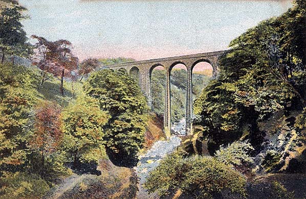 ![]() An early twentieth century tinted view of Healey Dell Viaduct, looking north-east. The dell is a delightful, tranquil spot within easy reach of Rochdale and the industrial villages of the Whitworth Valley. Not surprisingly it was, and still is, a popular location for country walks.