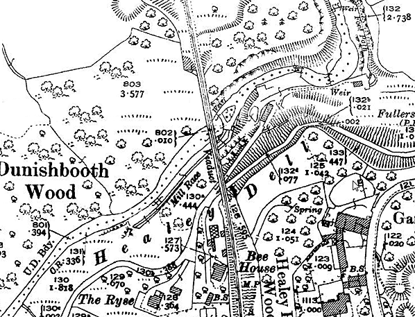 Eric Bollington and Jeffrey Wells collections ![]() Healey Dell Viaduct, a quarter of a mile south of Broadley station, looking north-east c1890. The Dell provided an opportunity to take refuge from the industrialised landscape of the Whitworth Valley, offering a picturesque, secluded walk beside the River Spodden with its waterfalls. Three smartly-dressed women are admiring the scenery from a rocky vantage point. The graceful arches of the viaduct added to the delight of this spot, as they still do today. Healey Mill, in the distance beyond the viaduct, has long been demolished.