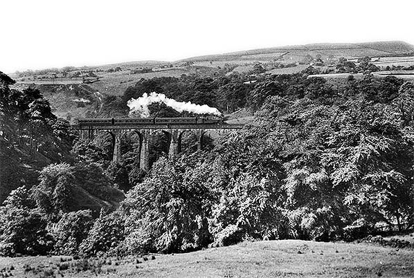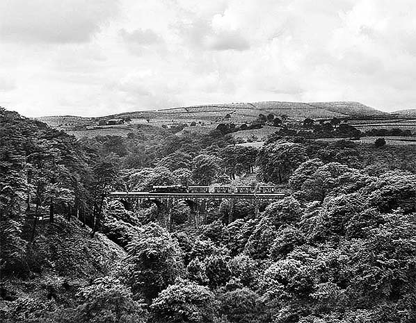 ![]() On 30 April 1963 a weedkilling train is travelling north over Healey Dell Viaduct. Hauling the train is No. 42750, a Hughes-designed ‘Crab’ 2-6-0 built in June 1927 at the LMS Crewe works. In August 1963 she was withdrawn from 39A, Gorton shed, to be cut up at Wards, Broughton Lane, Sheffield, in May 1964.