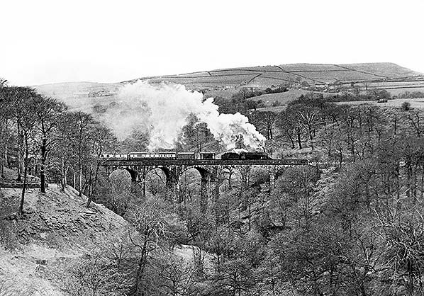 Photo by NS Roberts from John Mann collection ![]() Photos of passenger trains active on the Facit Branch in the LMS era are scarce. On this view of Healey Dell Viaduct No.194 is hauling its train northbound in June 1947, the month in which passenger services were suspended, never to be resumed. LMS No.194 is a Stanier 2-6-2T, classified 3P, meaning Class 3 Passenger. Bacup shed had a small allocation of these locomotives for use on the line; when passenger services finished they were moved away, largely to Southport.Withdrawals began quite early and the class became extinct during 1962 and none survived. No.194 became BR No.40194 and lasted until October 1961 when withdrawn from 27C, Southport shed. In July 1962 she was cut up by the Central Wagon Co, Ince, Wigan. The brake-third being in the middle of the train is rather odd and suggests that the train had been strengthened by the addition of another carriage, so perhaps it was market day at Rochdale or Bacup. The same train was photographed by
