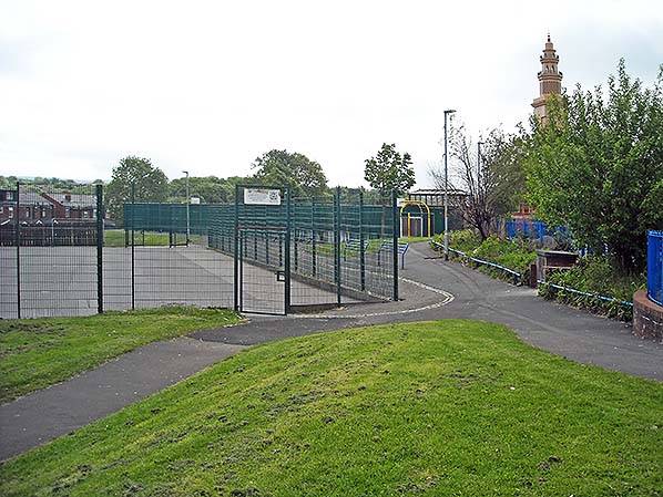 Looking south-east from the embankment between the site of Wardleworth station and the beginning of the Roch Viaduct (demolished in 1972). The 18-arch viaduct which carried the Rochdale – Bacup railway (the Facit Branch) was directly ahead in this view of June 2016; it stretched as far as Roch Wood, seen in the distance. The embankment in the foreground has been developed as a play area; a minaret of Jamia Masjid Bilal is seen on the right.
