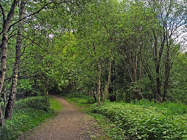 Looking north-west along the crest of the old railway embankment that carried the Facit Branch and two parallel sidings towards the Roch Viaduct. Almost 50 years since the last trains ran, the embankment has been developed by the Forestry Commission, in partnership with other organisations, as Roch Wood. The footpath provides a pleasant ‘green corridor’ through an inner area of Rochdale, and at the time of this visit in early June 2016 was lined with wild ramsons, bistort and bluebells. Ian Holt’s photograph of 18 August 1967 from a mineral train shows a similar viewpoint; the contrast between the urban industrial scene then and a tranquil rural retreat now could not be more striking.