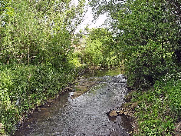 The River Roch, looking north-east in June 2016. The Roch Viaduct on the Rochdale – Bacup railway strode across the river at this point, and collapsed into it in July 1972 when a test explosion unexpectedly felled much of the structure.