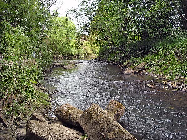 The River Roch, looking north-east in June 2016. The Roch Viaduct on the Rochdale – Bacup railway strode across the river at this point.