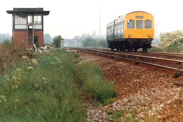 Widnes East signal box seen shortly after it had suffered a fire on 5 April 1987. This BR LM15 type box had replaced a CLC box dating from 1891 on 8 April 1956. It was located further west than its predecessor in the fork of Widnes East Junction. The GC & MR Joint Railway had passed to the left of the box.