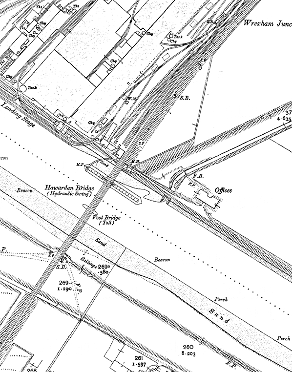 The Hawarden Bridge was located on the Manchester, Sheffield & Lincolnshire Railways (MS&LR) Chester Northgate to Hawarden Bridge Junction line. Hawarden Bridge Junction was on the south side of the River Dee just to the north of Shotton. At Hawarden Bridge Junction the MS&LR line made an end-on connection with the Wrexham, Mold & Connahs Quay Railway’s (WM&CQR) ‘Hawarden Loop’ line which connected into that company’s original Wrexham and Buckley line of 1866. ![]() 1913 1:2,500 OS map