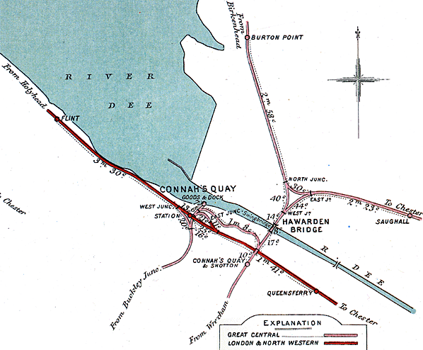 For the MS&LR the single biggest engineering obstacle was the River Dee. Not only was the river a physical barrier, but it was heavily used by ships, and the interests of the shipping companies had to be considered. Navigation along the river had to be maintained. The solution was to create a swing bridge which could be opened to allow vessels to pass. On 16th August 1887 Sir William Gladstone MP (who had previously been Prime Minister - and would be again in 1892) laid the first cylinder of the bridge. Gladstone lived at Hawarden and had been a supporter of both the MS&LR and the WM&CQR schemes. The bridge was to be a remarkable engineering feat. It was designed by Mr C A Hobson and was constructed by contractors Messrs John Cochrane & Sons of Westminster. The steel structure and machinery construction was subcontracted to Horsley Bridge Company of Tipton, Staffordshire. The Chief Engineer for the entire project was Mr Francis Fox, and the total cost of the bridge was £71,000. ![]() 1914 junction diagram The bridge was substantially complete by the early months of 1889. It consisted of three arched spans. The largest span, 278ft in length, was on the north side, and it was the span that opened. At the time it was the largest opening structure in Great Britain. The other two spans were fixed. The bridge carried a double-track railway, and on the outsides of the spans were footpaths which pedestrians could use on payment of a toll. On the north bank, west of the line, there was a brick building and tower. The working mechanism was housed in the building, and the tower controlled both rail and river traffic. ![]() Hawarden bridge open in 1910