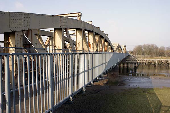 ![]() Hawarden Bridge was provided with pedestrain footpaths on either side of the railway lines from the day it was opened. The MS&LR and the companies that followed exacted a toll for crossing the bridge. In this view looking north in March 2011 the footpath on the east side of the bridge is seen.