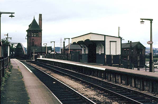 ![]() Looking south towards Hawarden Bridge from the north end of the southbound platform of Hawarden Bridge station on the 2nd of August 1973. To the right of the bridge is a brick built tower. It was the control tower for the bridge. The working mechanism, originally steam powered was housed at the base of the tower. The tower was demolished in 1980 after the bridge had been fixed into position.