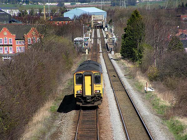 ![]() An Arriva Trains Wales Wrexham Central to Bidston Borderlands service can be seen descending the steep incline of the Hawarden Loop line towards Shotton station in March 2011. Hawarden Bridge is seen in the background. Photo by Paul Wright